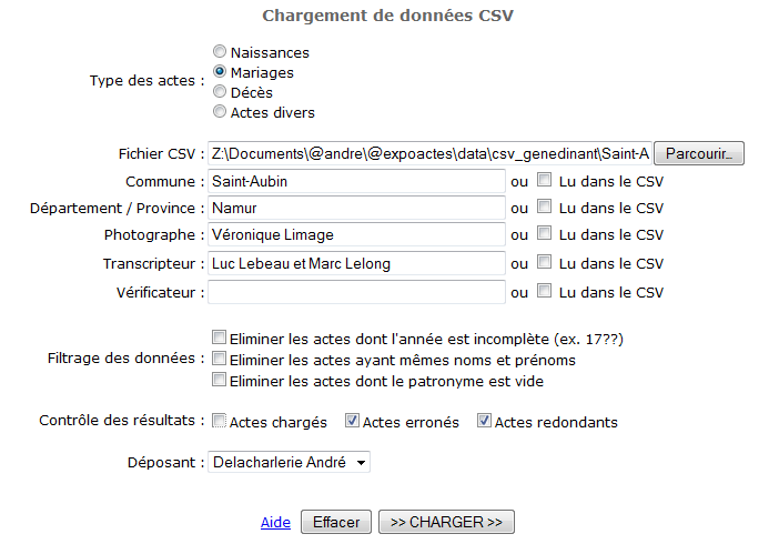 Le premier écran de chargement permet de sélectionner le fichier CSV à charger et préciser quelques paramètres de chargement.