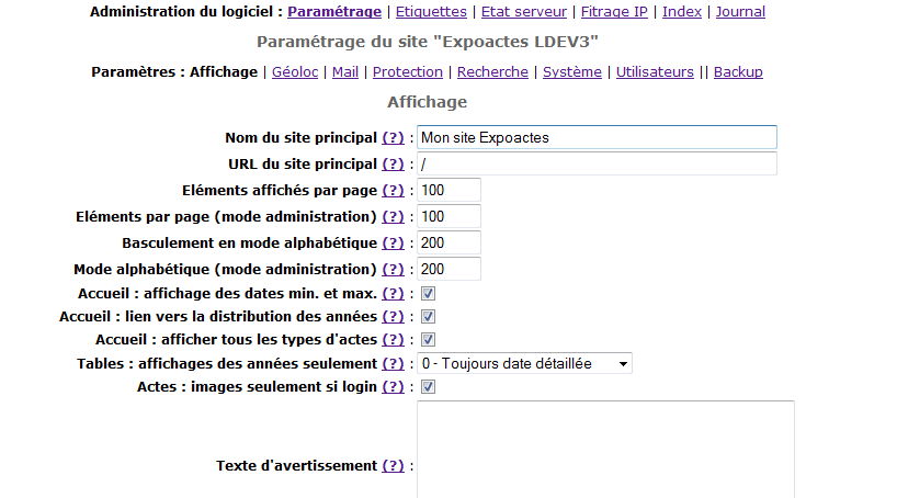 Pour faciliter la configuration, les paramètres ont été regroupés en plusieurs thèmes : Affichage, Système, Utilistateurs ... Une nouvelle section "Etiquettes" (à partir de la verson 3.0) permet de modifier les intitulés des zones affichées dans les actes.
